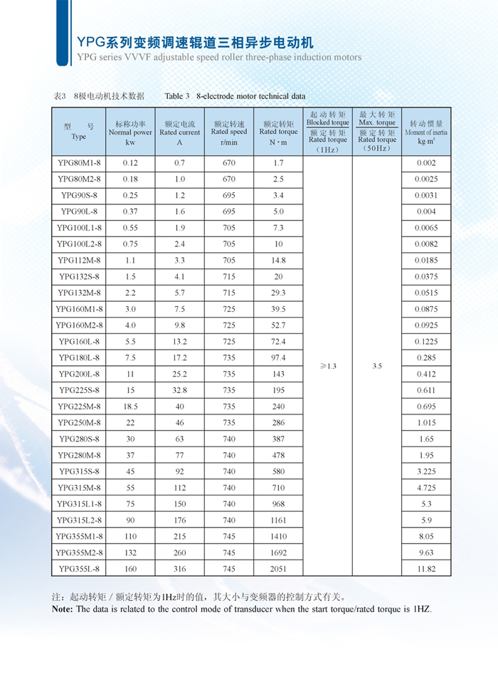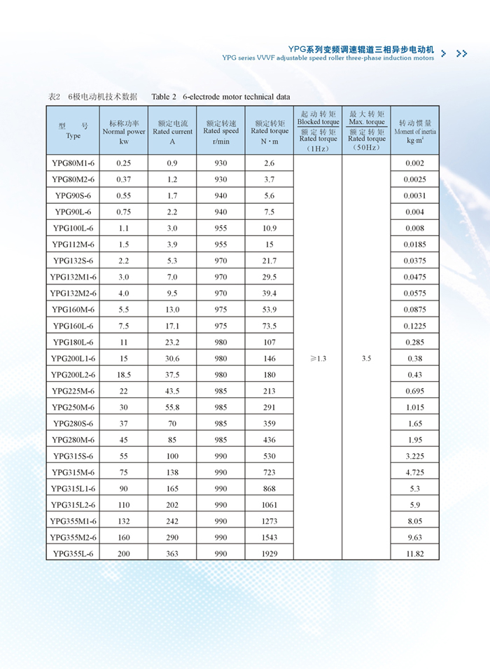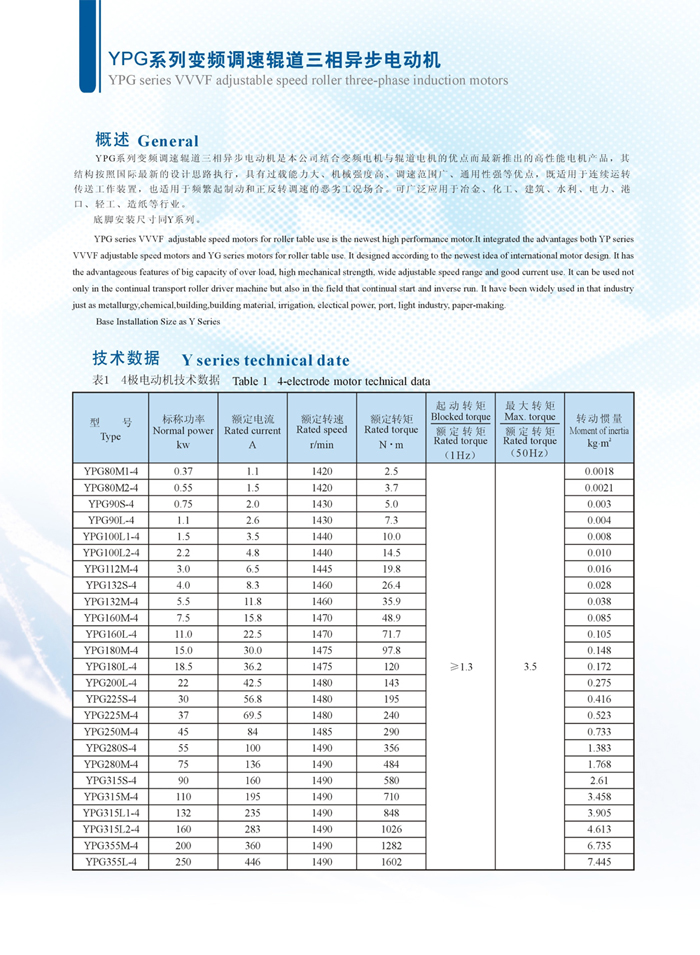 YVPG系列輥道用變頻調(diào)速三相異步電動(dòng)機(jī)。它具有體積小、調(diào)速范圍廣、運(yùn)行可靠、維護(hù)方便等優(yōu)點(diǎn)。電動(dòng)機(jī)增加了不停機(jī)軸承潤滑補(bǔ)給裝置,采用耐高溫潤滑脂。電動(dòng)機(jī)具有加強(qiáng)的機(jī)械結(jié)構(gòu)強(qiáng)度,利用變頻器的低頻起動(dòng)功能和制動(dòng)功能,可以實(shí)現(xiàn)頻繁起動(dòng)、制動(dòng)和正、反轉(zhuǎn),并具有較高的過載能力。電動(dòng)機(jī)附加獨(dú)立的軸流風(fēng)機(jī),保證電動(dòng)機(jī)在不同的轉(zhuǎn)速均具有良好的冷卻效果。為了適宜冶金工業(yè)單獨(dú)驅(qū)動(dòng)懸臂輥道的需要,該系列電動(dòng)機(jī)的軸伸較長,輥筒可直接安裝在電動(dòng)機(jī)的輸出軸上,電動(dòng)機(jī)通過大法蘭盤直接與輥道蓋板法蘭聯(lián)接,無需另加聯(lián)軸器、軸承座、軸承等,簡化了傳動(dòng)結(jié)構(gòu)、減小了故障環(huán)節(jié)。